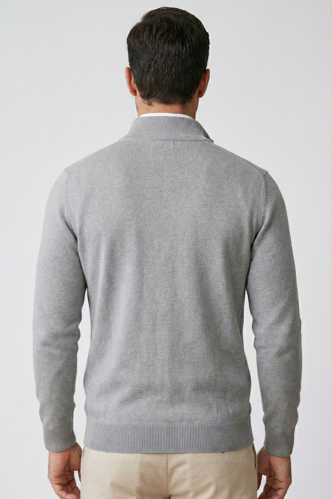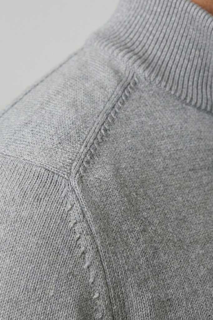 Maglione a mezza zip in cotone puro, perfetto per uno stile casual raffinato. Il design minimalista con zip centrale offre versatilità: indossalo aperto come layering piece o chiuso per calore extra. La tonalità Grigio Scuro si abbina facilmente con i nostri jeans signature, creando outfit completi e senza sforzo. Tessuto morbido e durevole, ideale per la transizione tra stagioni.