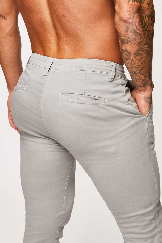 Pantalone chino skinny spray-on di colore grigio ghiaccio realizzato con il nostro tessuto stretch ingegnerizzato su 4 vie. Questo stile da uomo è rifinito con hardware con logo impresso.